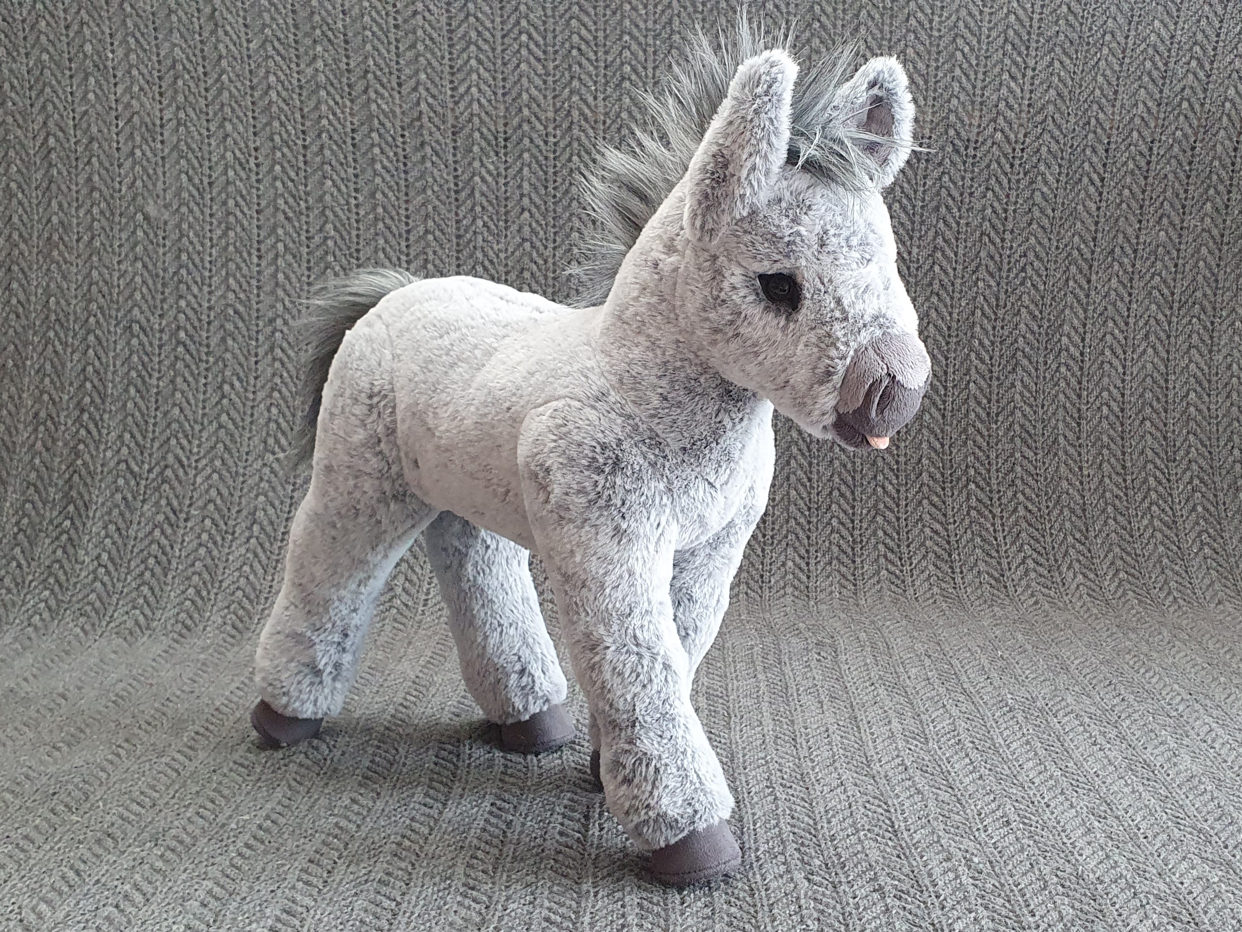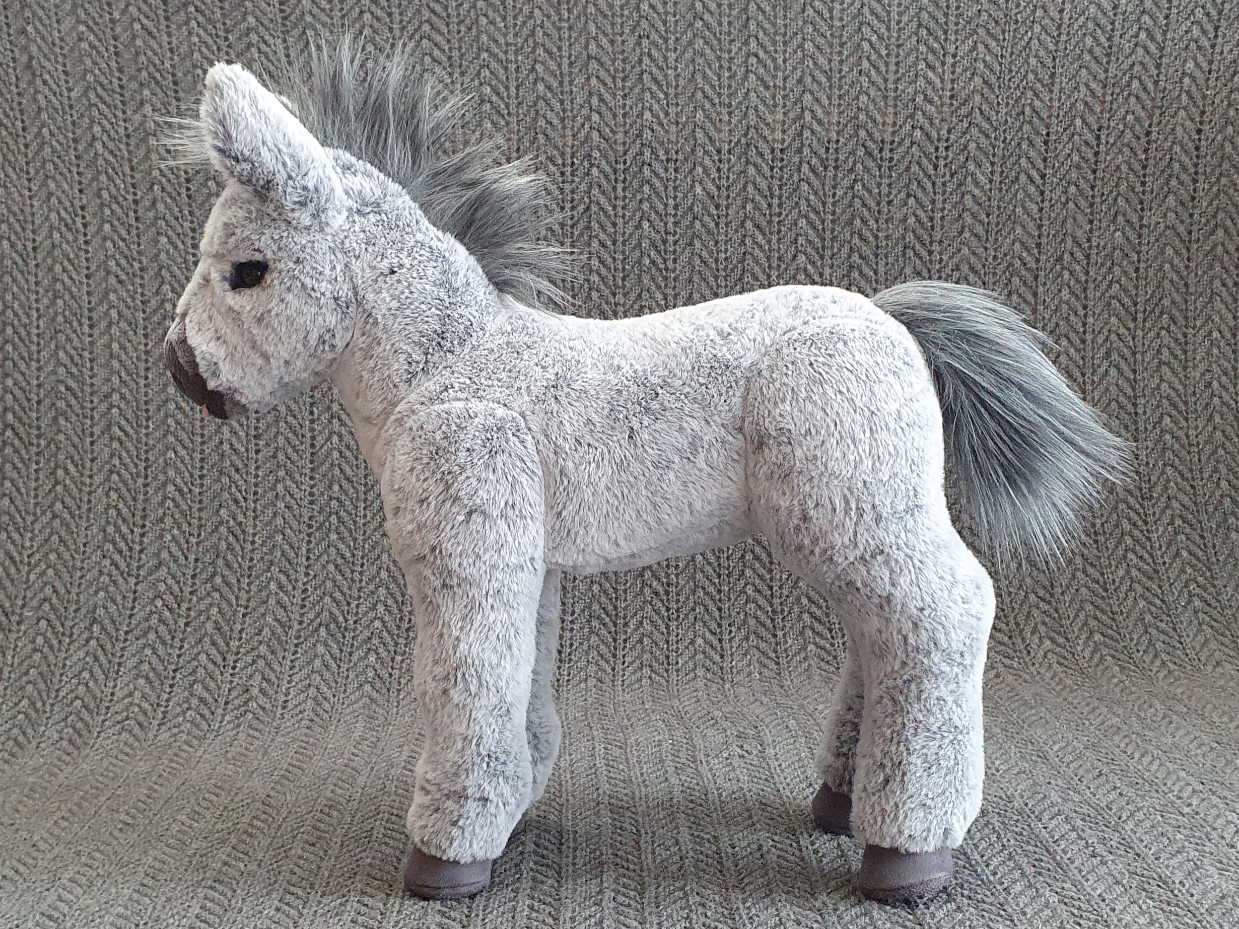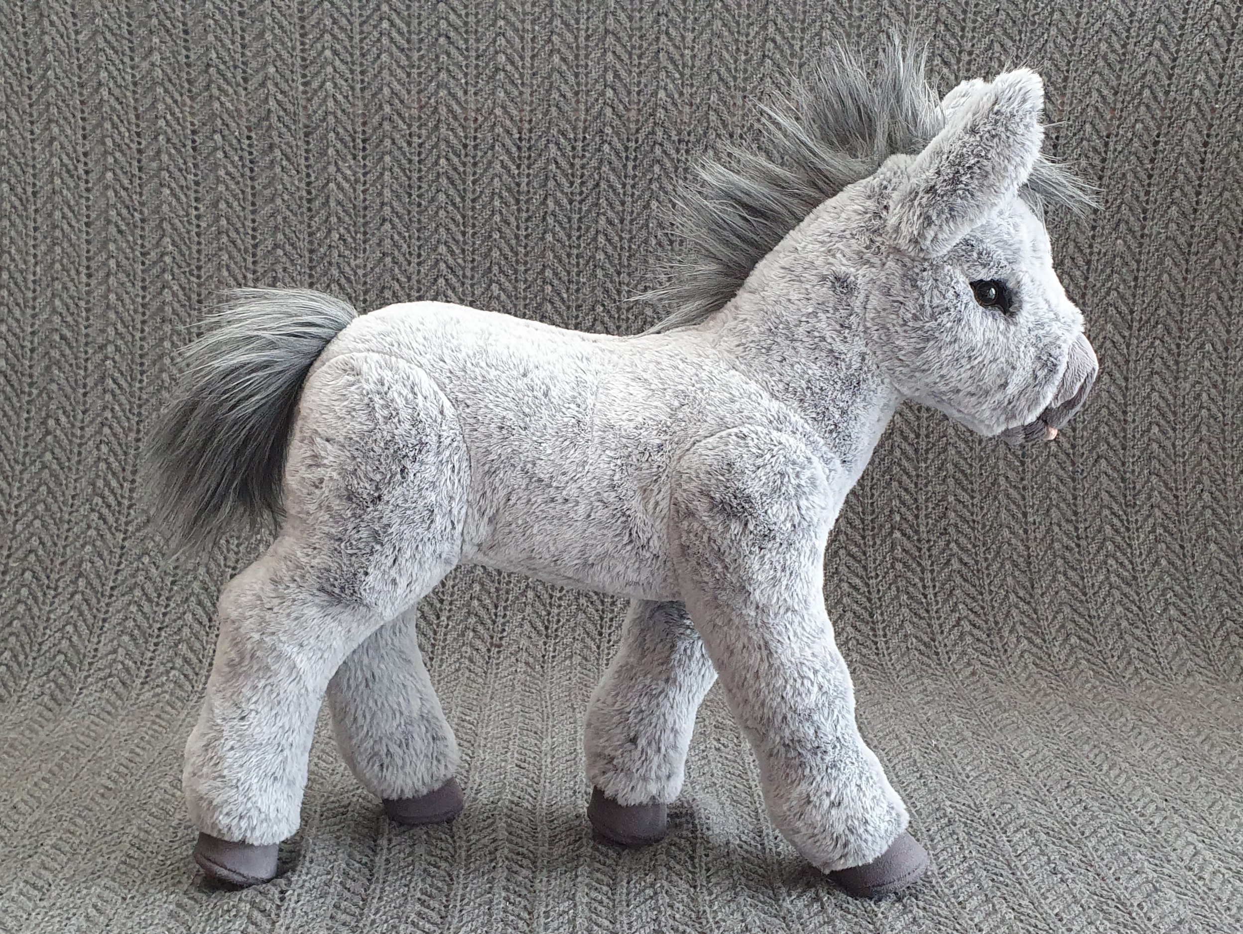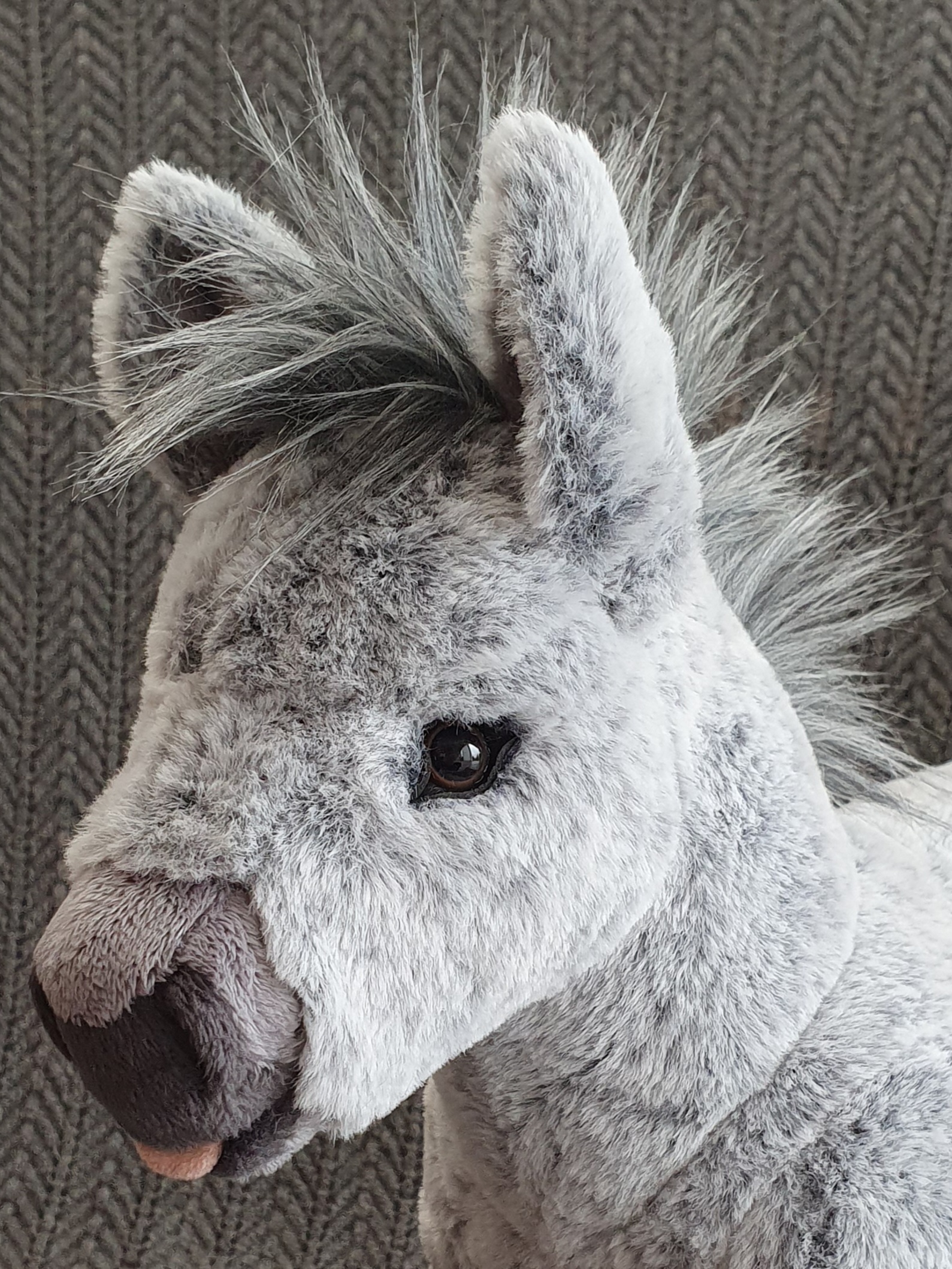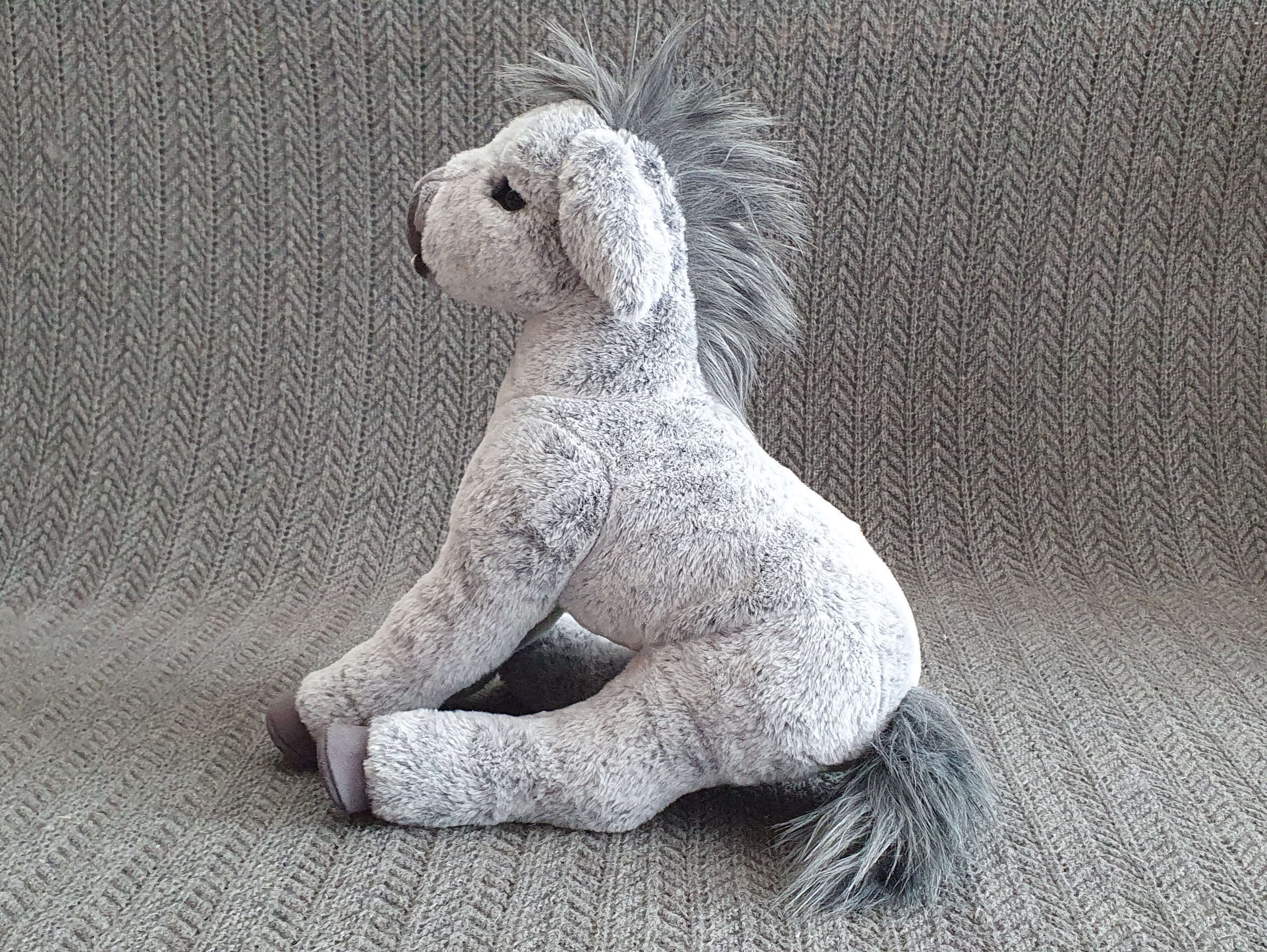 Say hello to Sterling the mottled grey horse! This handmade plushie stands about 36 cm tall and is semi-posable, meaning that it is able to alter between basic standing and sitting positions. It is made in a lifelike style, using super soft rabbit style fur, and features many intricate details, such as fully handsewn markings, realistic hooves and a detailed muzzle with actual nostrils. There's even a cute little pink tongue, that can be tucked away inside the mouth. All in all this plushie is made from a whopping 114 individual pieces, most of which are handsewn!
