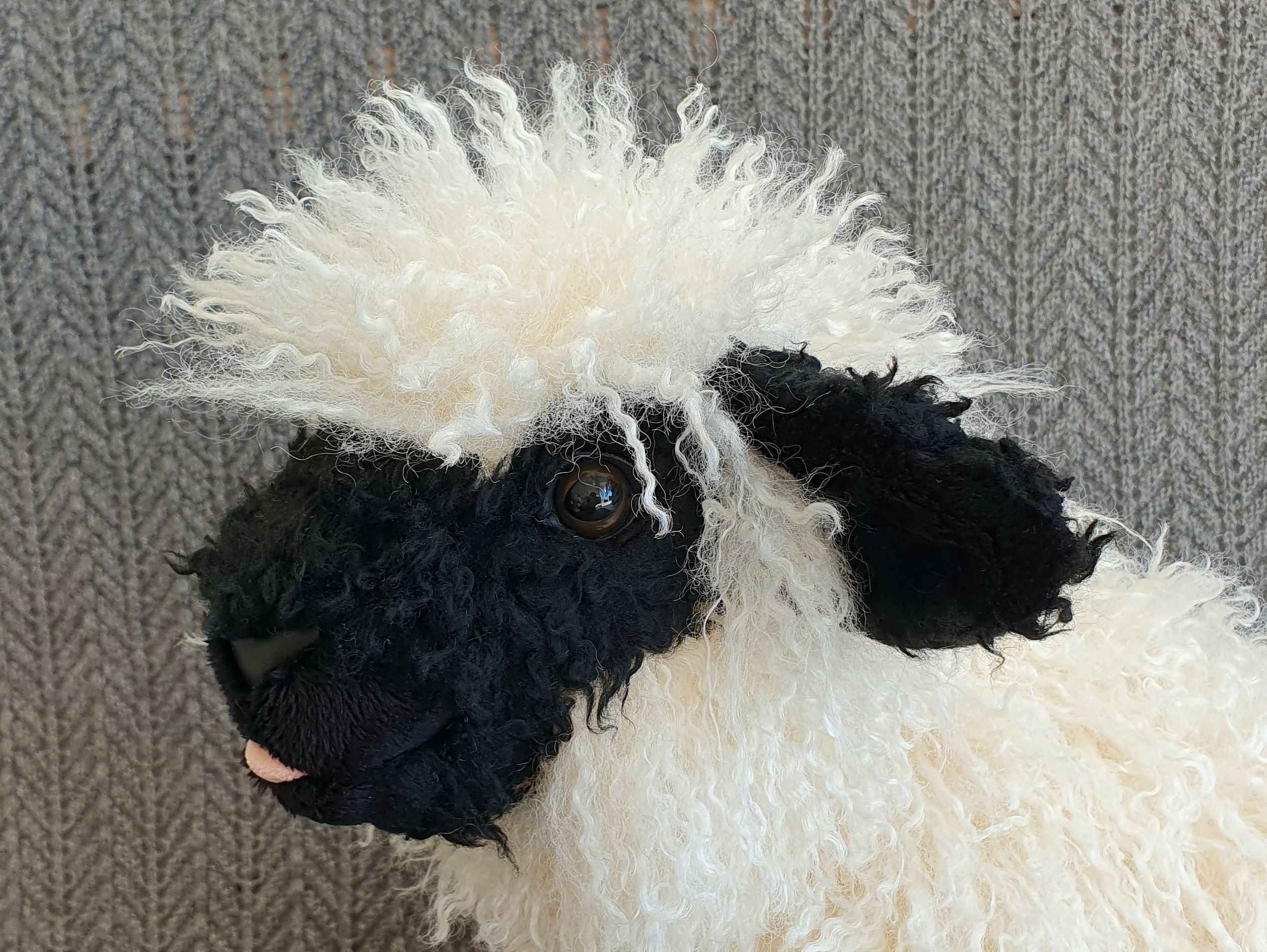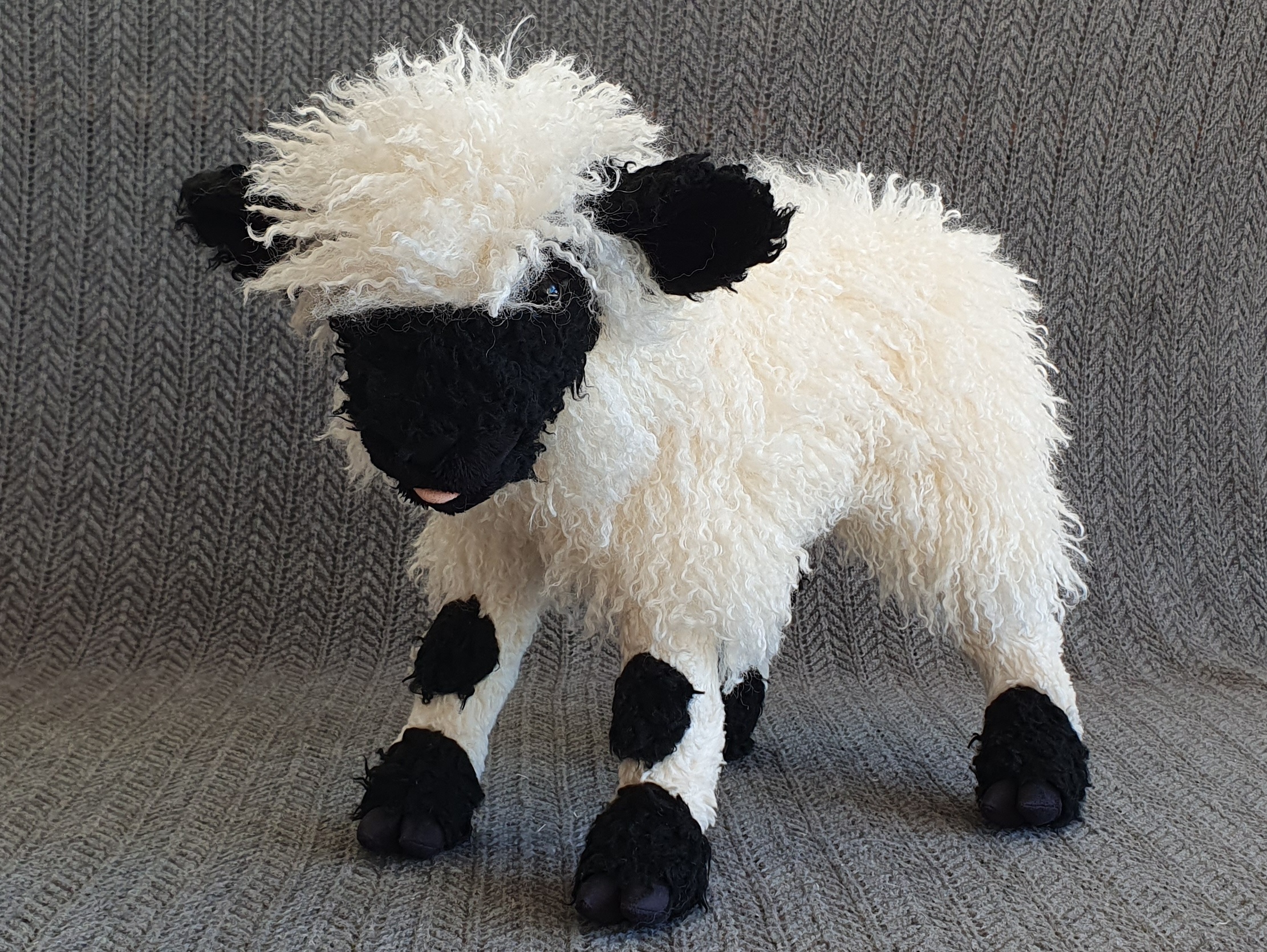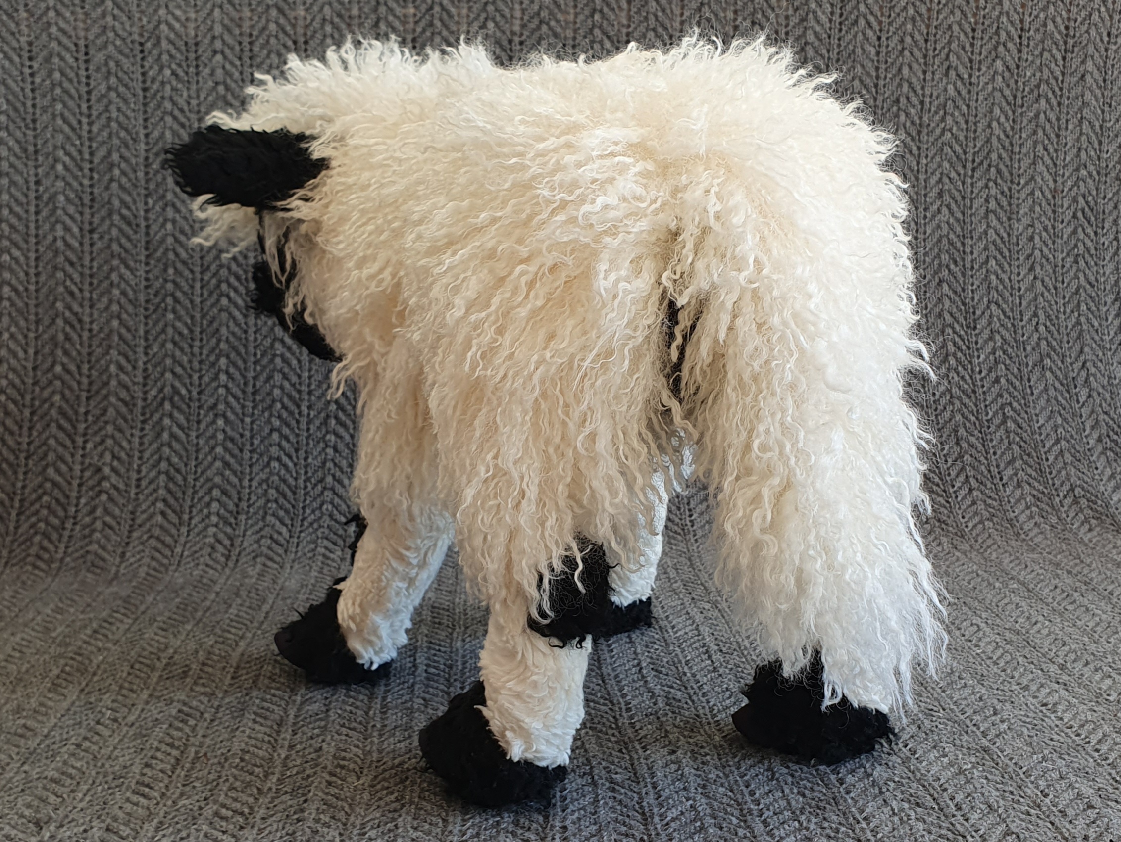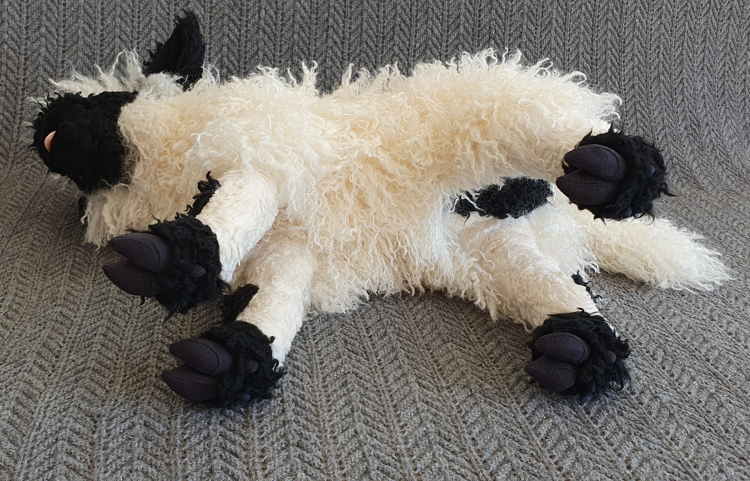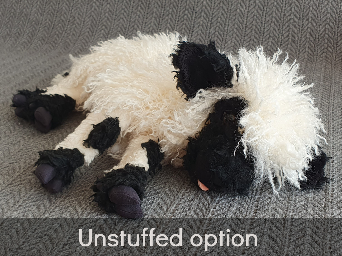 The wooly part of the body is made from super soft llama style faux fur with tight curls and a pile length of about 50 mm. The markings and lower portion of the legs is made with two types of coarse curly faux fur with much shorter pile lengths. The feet are made from synthetic suede, a fabric that is made to resemble brushed leather and has a soft feel to it. The less furry parts of the muzzle are made with two lengths of minky and the tongue is made from velour. The plushie has been fitted with 14 mm plastic safety eyes. Black imitate leather has been used for the nose, and to outline the eyes, in order to improve their shape and make them look more lifelike. Siliconized polyester fibers have been used to stuff the plushie. The legs have been sealed off internally, allowing them to be more firmly stuffed than the rest of the body. Plastic beads have been added to the tail tip and feet for extra weight.
